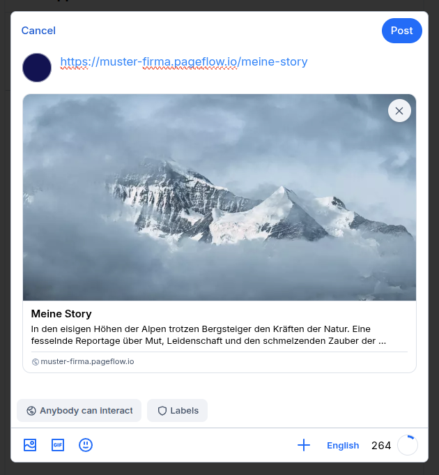 Wenn du deinen Beitrag in sozialen Medien teilst, verwenden Plattformen wie Facebook, X oder LinkedIn bestimmte Informationen, um eine ansprechende Vorschau anzuzeigen. Du kannst festlegen, welches Bild und welche Beschreibung dabei verwendet werden.